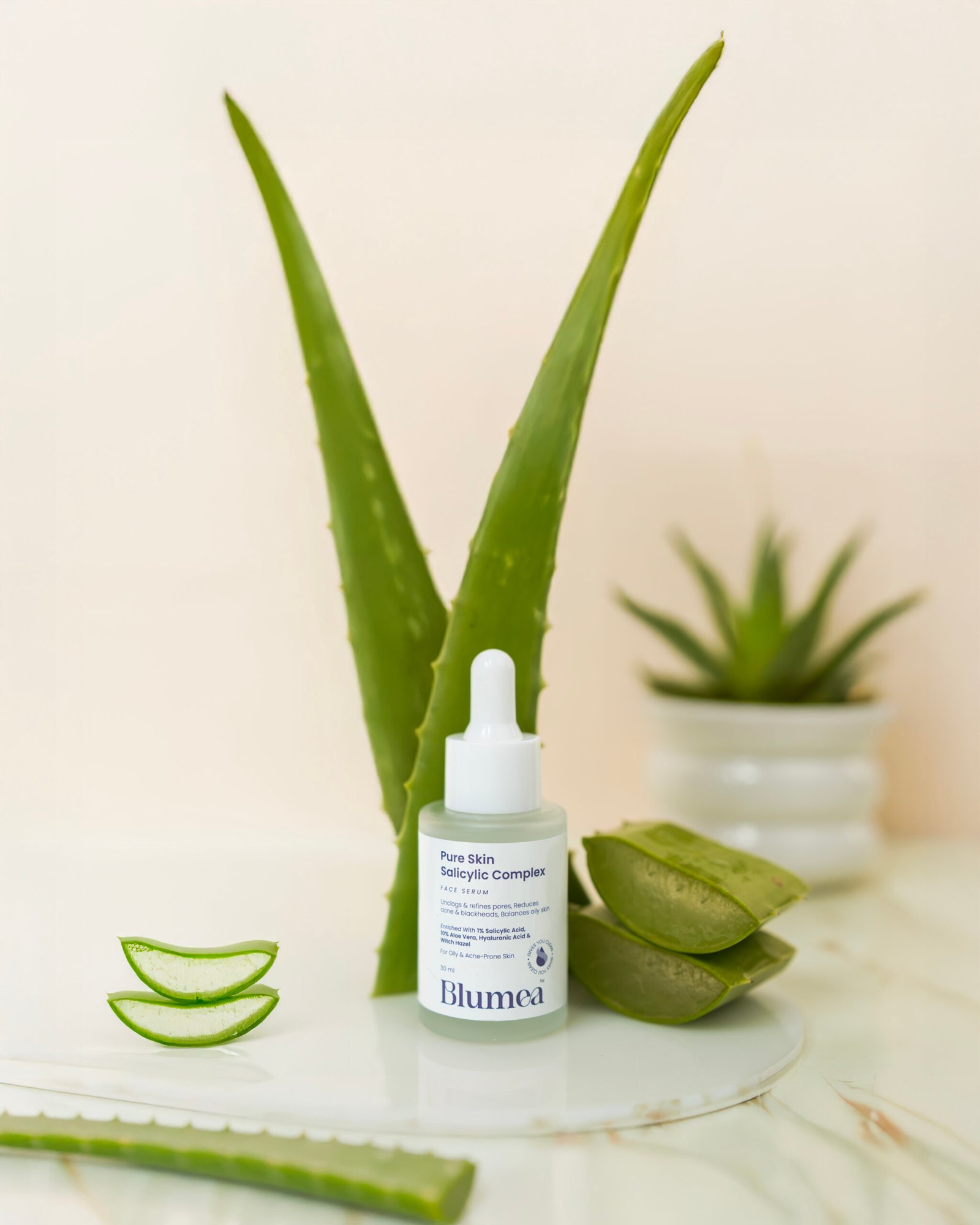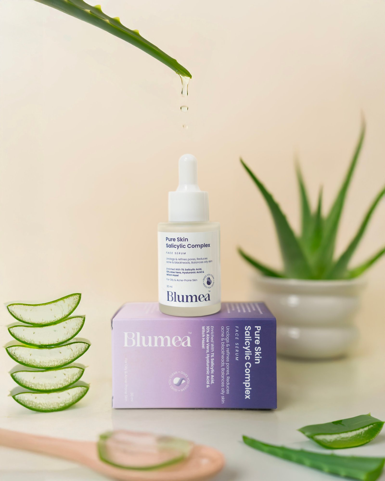 Blumea Pure Skin Salicylic Complex is a gentle yet effective facial serum designed for oily and acne-prone skin. Formulated with 1% Salicylic Acid, 10% Aloe Vera, Hyaluronic Acid, and Witch Hazel, it deeply cleans pores, reduces acne and blackheads, and controls excess oil without over-drying the skin. This lightweight formula helps soothe irritation while maintaining hydration and skin balance.