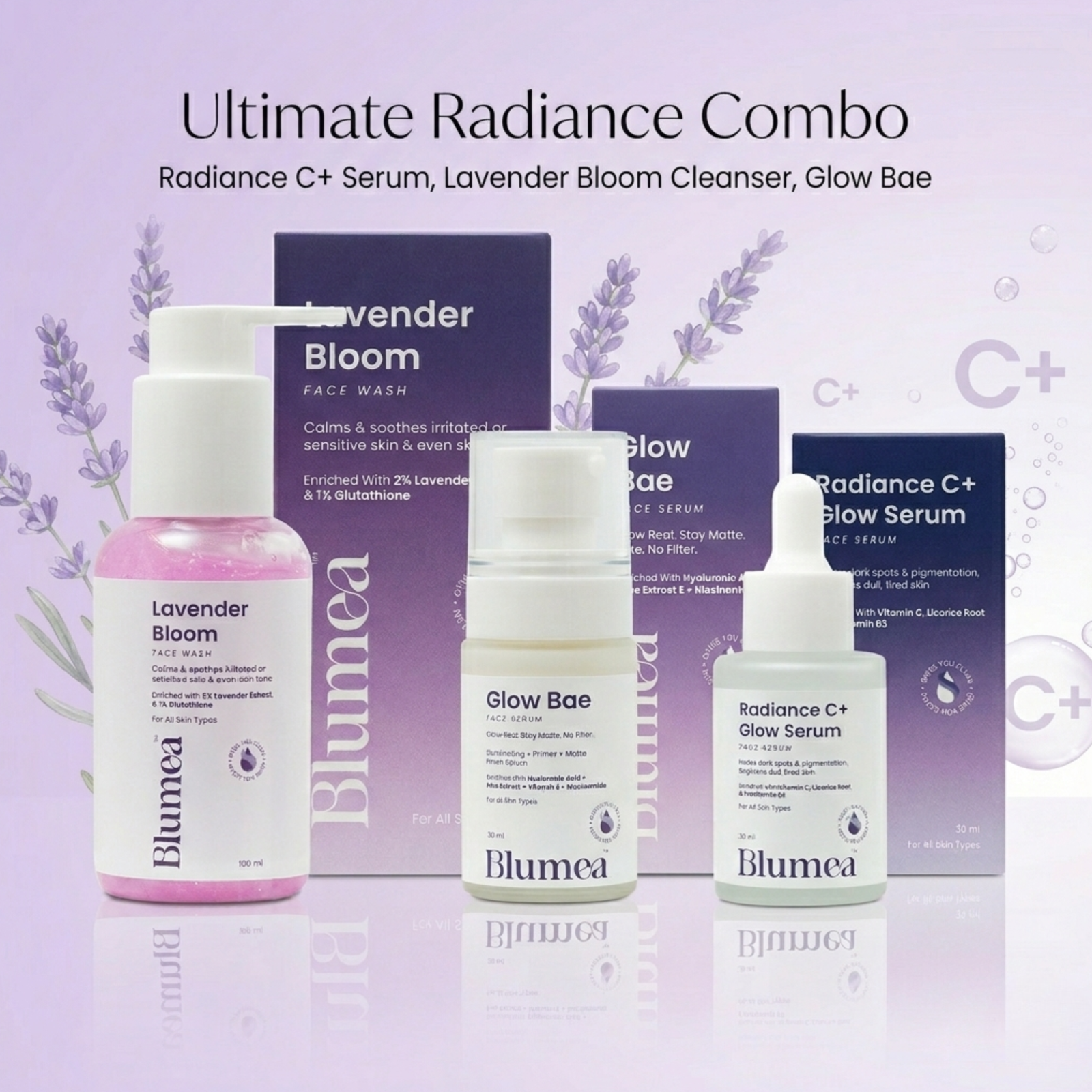 Start with Lavender Bloom Face Cleanser to gently remove excess oil, dirt, and impurities while soothing and refreshing the skin. Follow with Radiance C Plus Glow Serum to help brighten the complexion, boost radiance, and improve overall skin clarity. Finish with Glow Bae to nourish and hydrate the skin, sealing in moisture and glow. Together, this pack supports smoother texture, balanced hydration, and visibly glowing skin without feeling heavy or greasy.